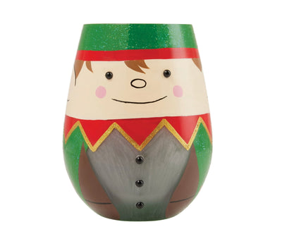 Sip in festive fun with this cheerful Lolita stemless wine glass, featuring a smiling elf in sparkling green garb, rosy cheeks, and a playful hat. With his elf ears and jolly demeanor, this glass adds a touch of holiday magic to every sip!