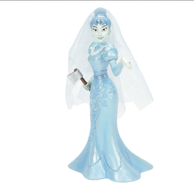 Jim Shore's rendition of the ghost bride from the Haunted Mansion is hauntingly beautiful. Draped in an ethereal gown adorned with intricate rosemaling designs, she clutches an ominous axe, warning of her eternal presence within the manor's halls.