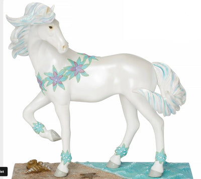 The artistic inspiration for a Painted Pony often comes at unexpected times. This artist was enjoying a meal at a favorite restaurant in Maui when she noticed a picture on the wall of a woman wearing a beautiful flower lei around her neck. Her look was both calming and relaxing, a feeling the artist wanted to recreate by imagining a beautiful lei-draped horse walking along the beaches of Maui, taking in the soothing sounds of the ocean waves.